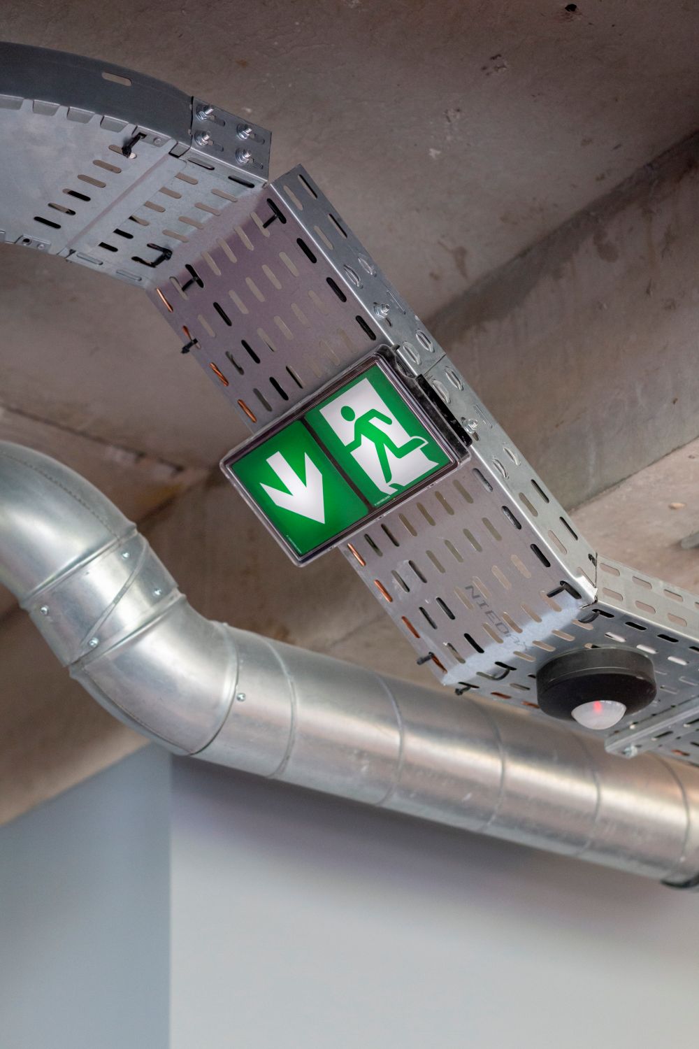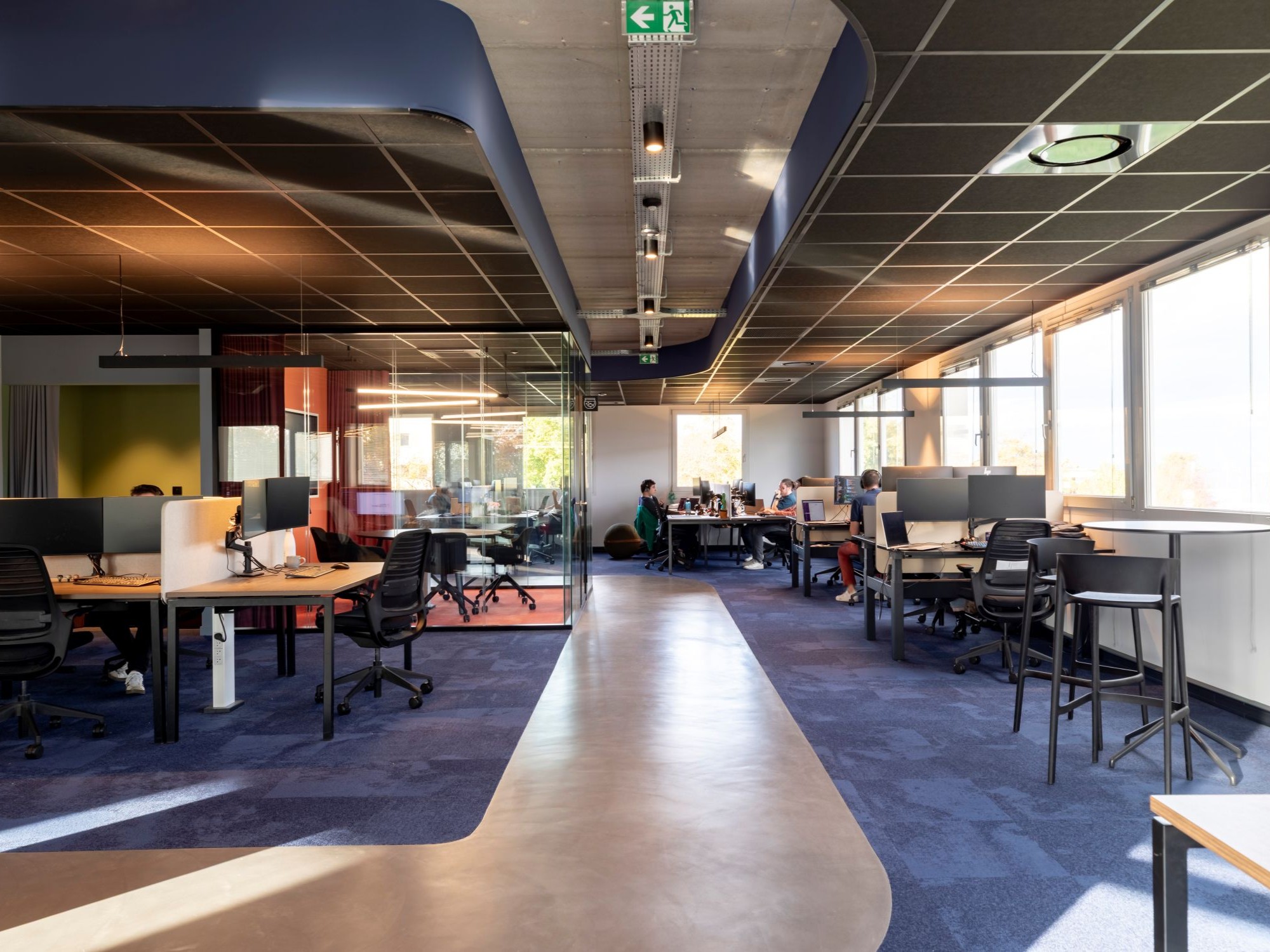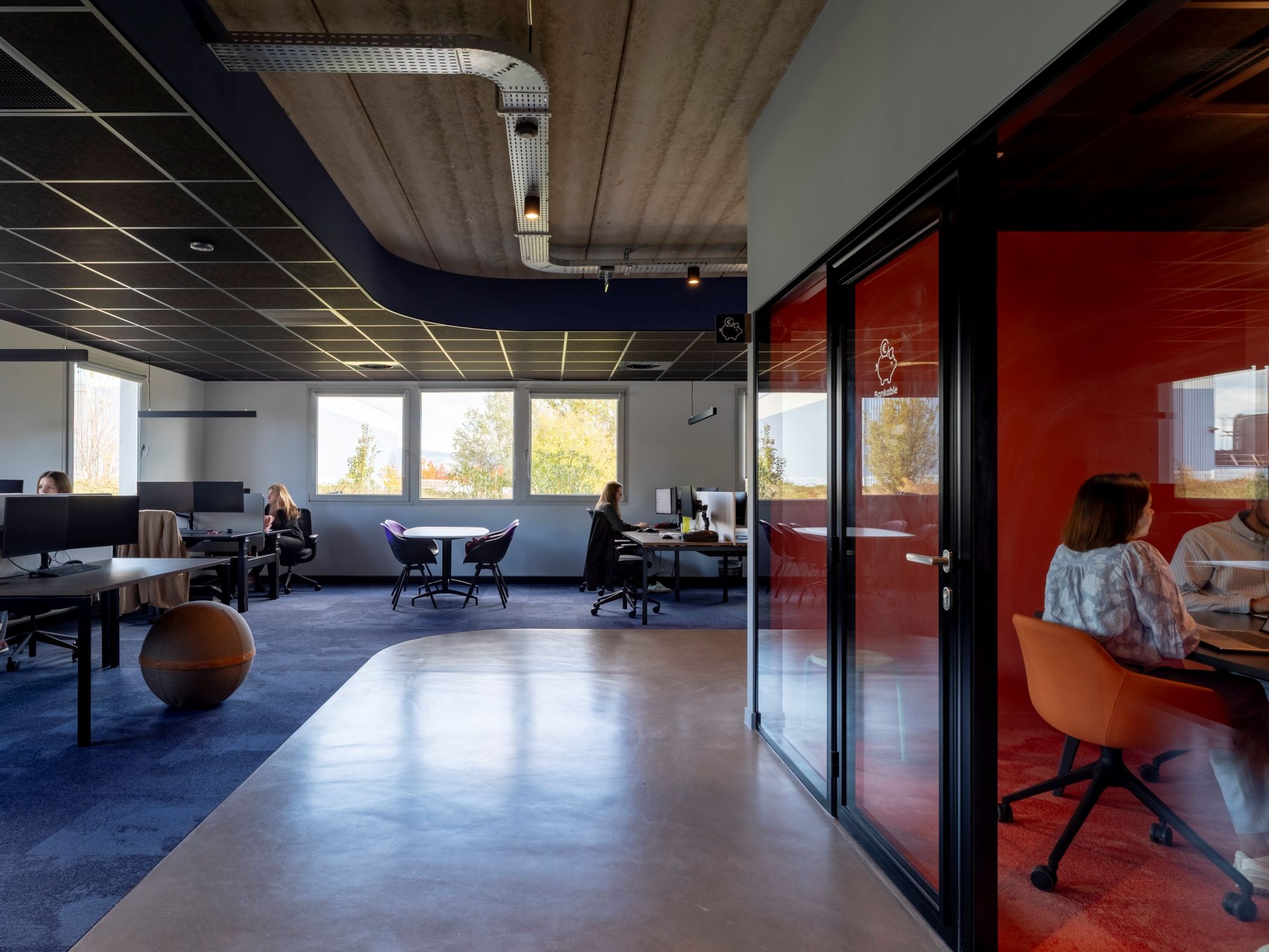 Les circulations sont matérialisées par un sol en béton millimétrique et un plafond technique apparent, soulignant les flux et valorisant la matérialité brute du bâtiment : une jolie surprise lors de la démolition des anciens faux-plafonds.