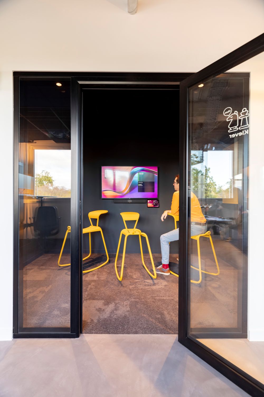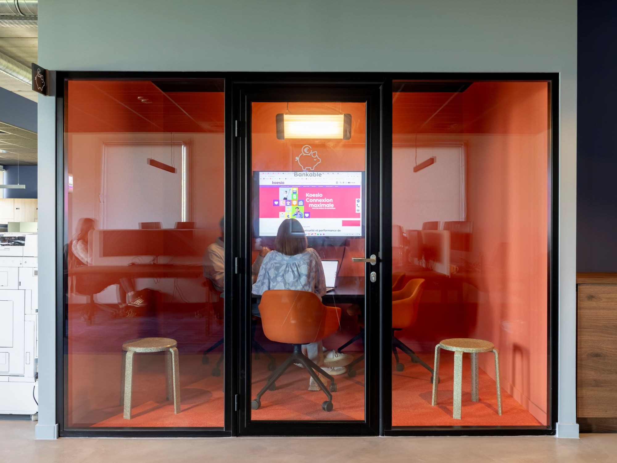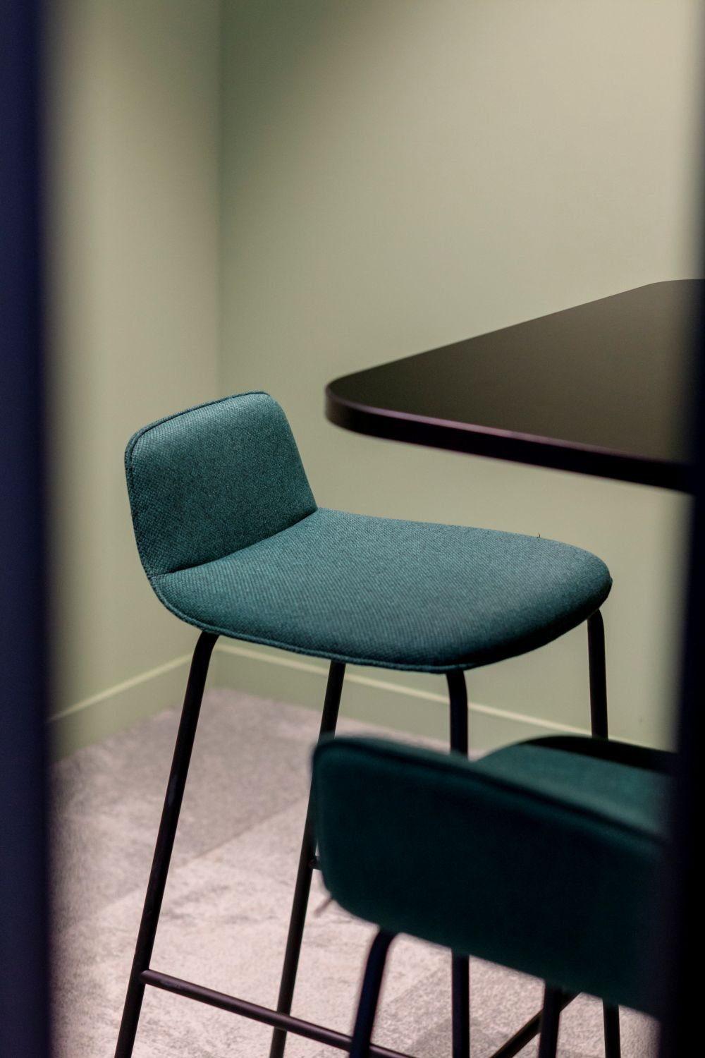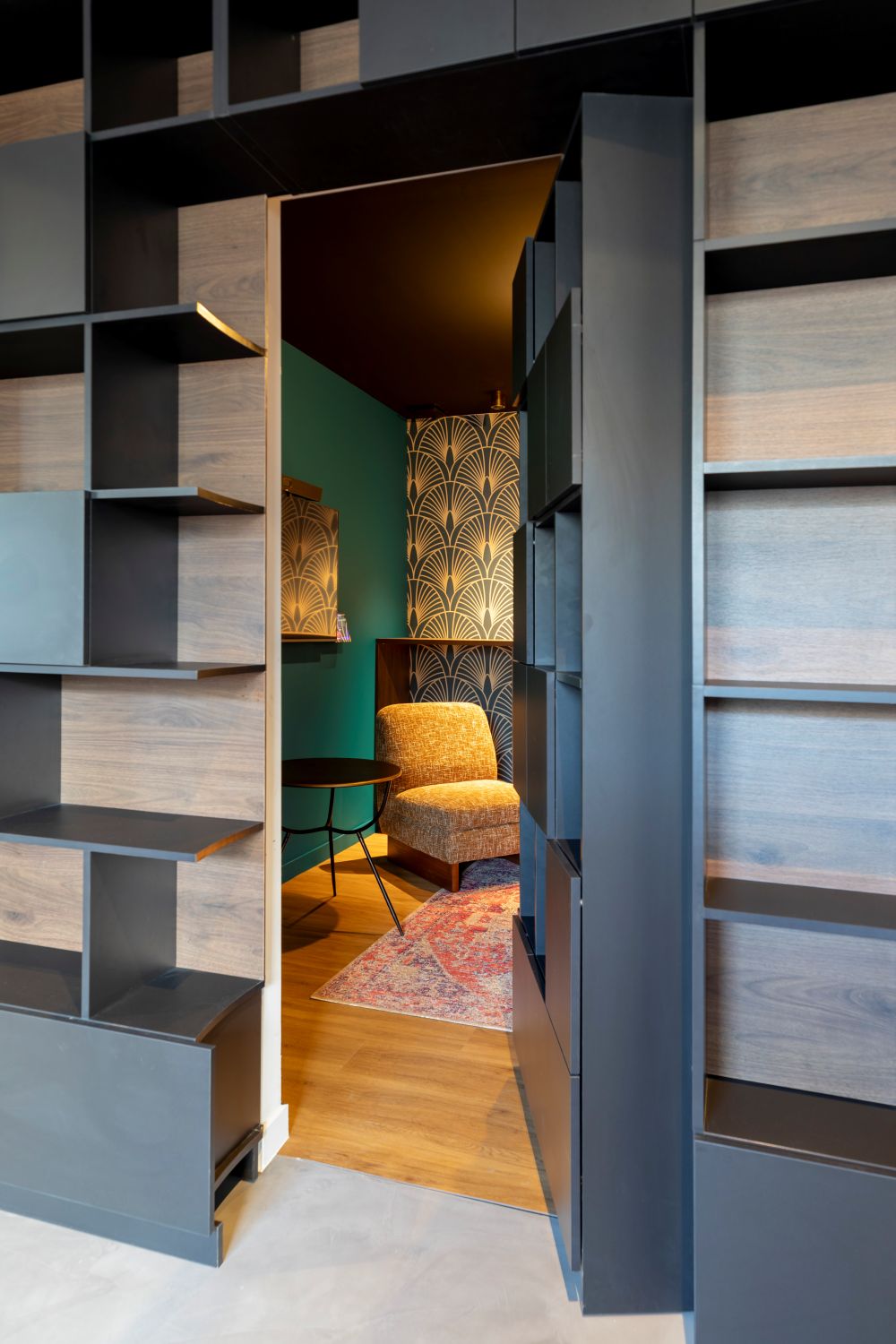 Les postes de travail des collaborateurs ont été placés près de la lumière naturelle, avec moquette et faux-plafond pour garantir le confort acoustique. L’espace se déploie ensuite en box individuels ou partagés, salles de réunion, espaces collaboratifs et salon informel. Discrètement caché derrière une bibliothèque, dans l’esprit d’un speakeasy, un espace vidéo. À vous de négocier avec KAM pour qu’ils vous dévoile le secret de l’ouverture.