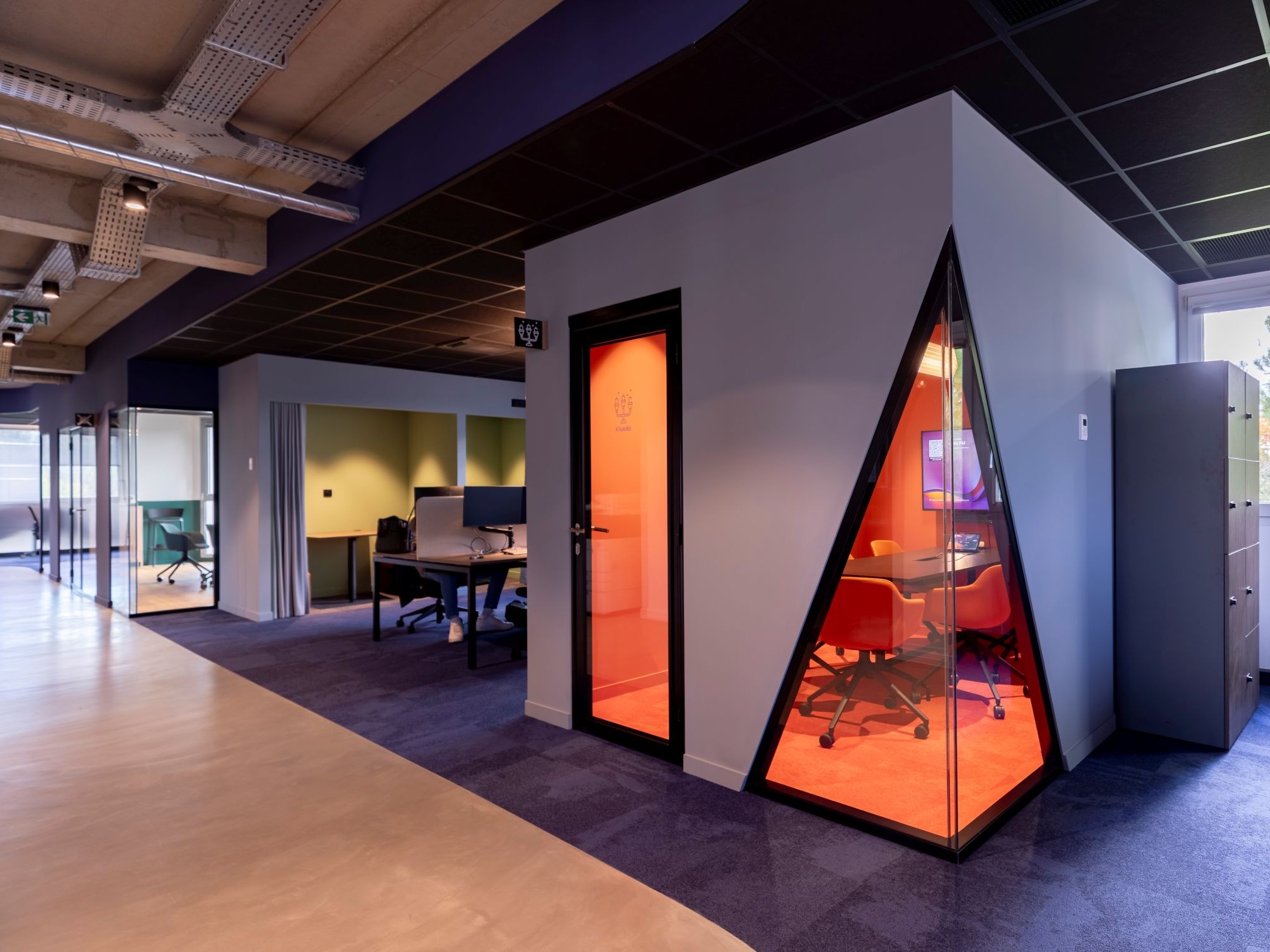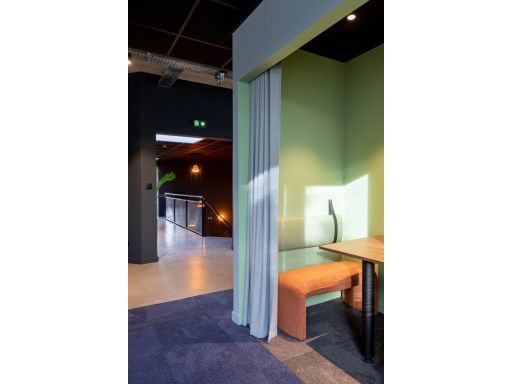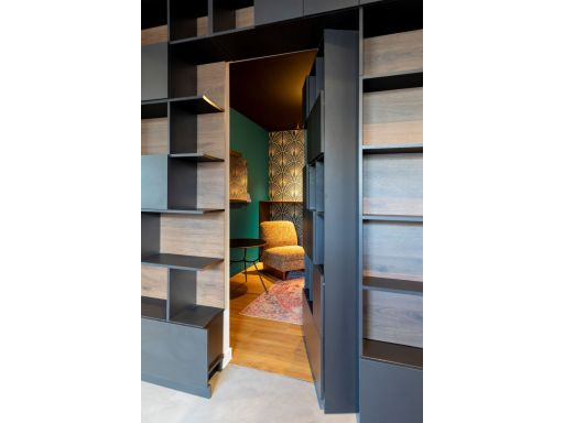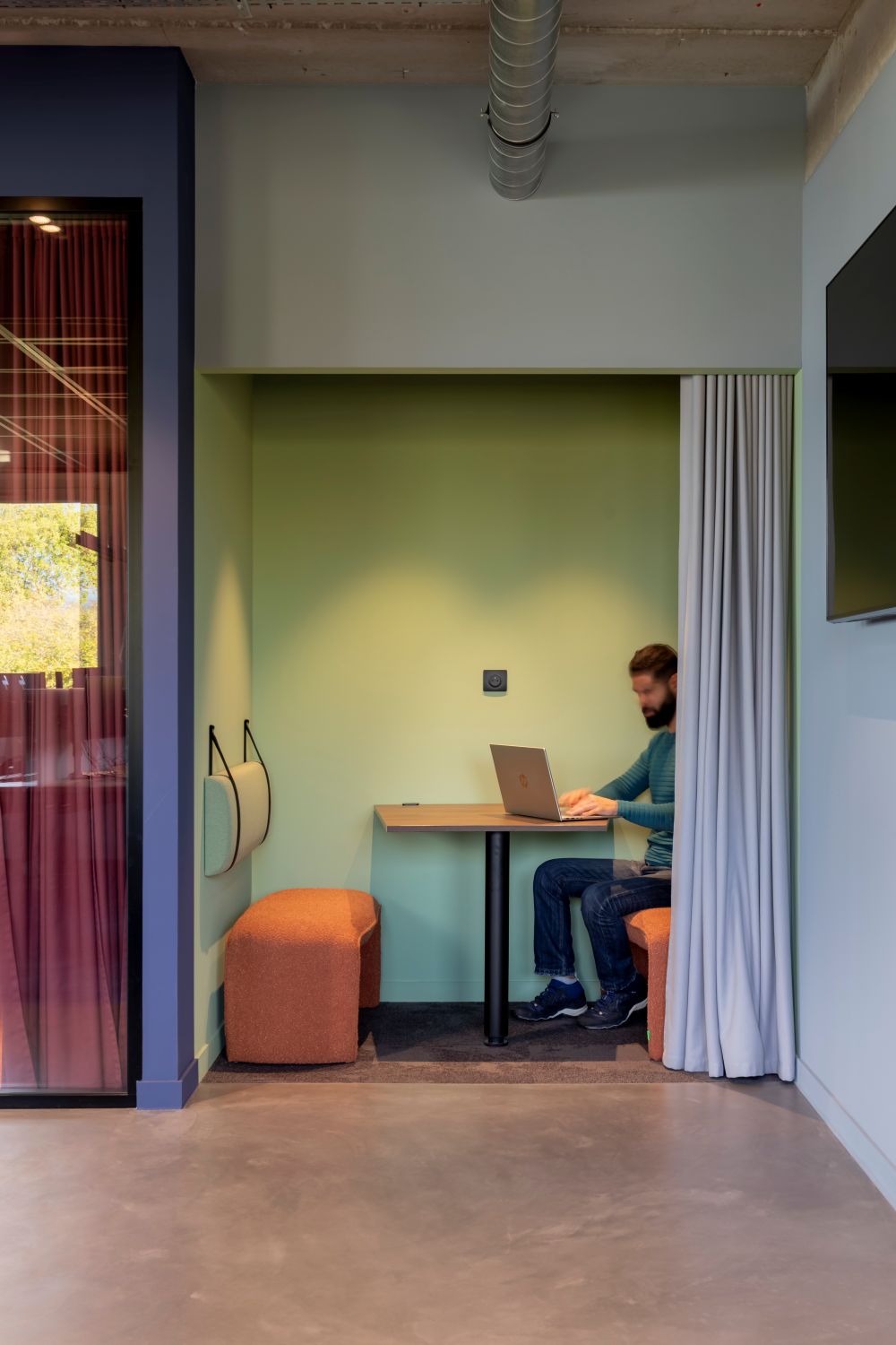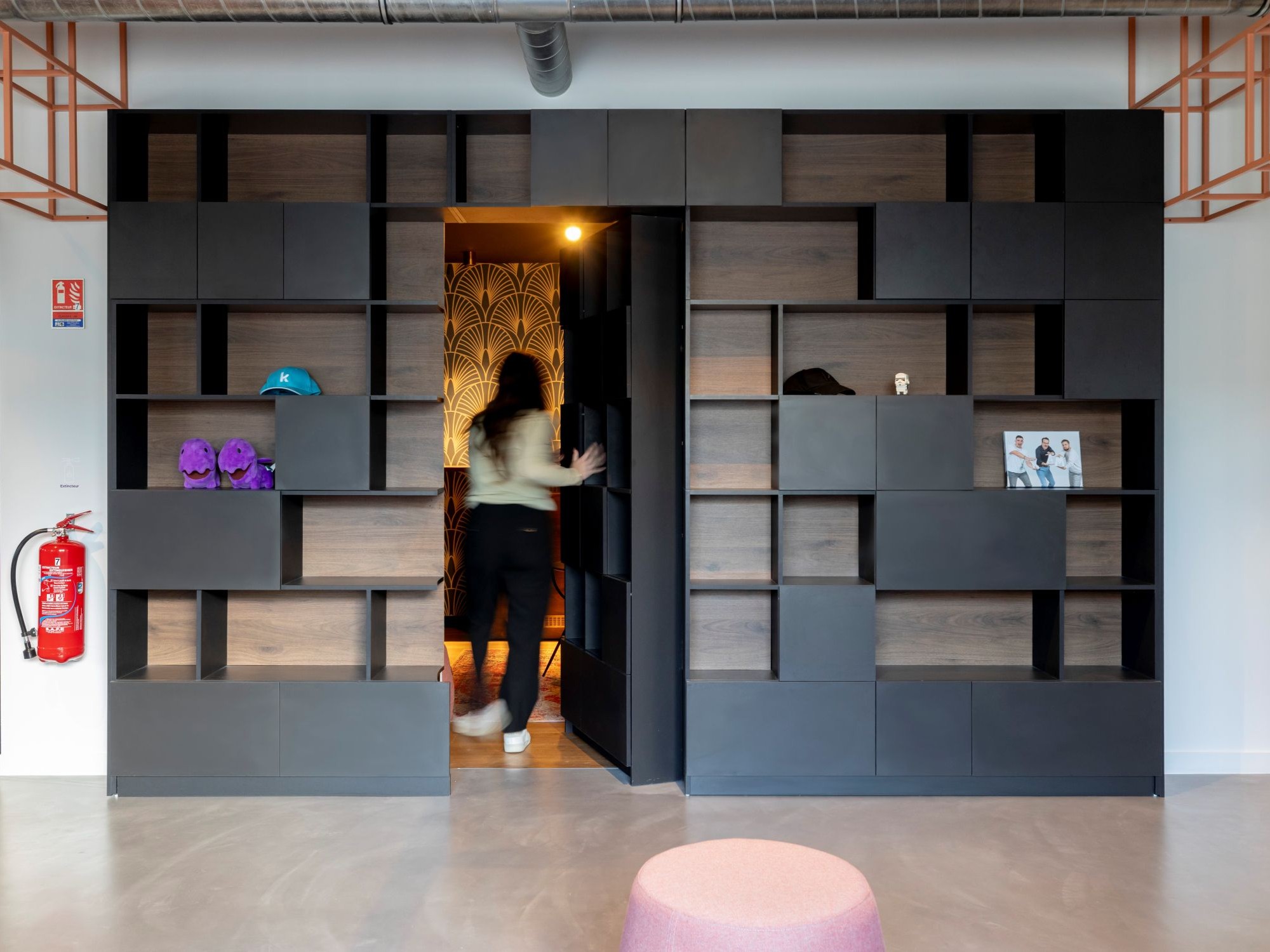 Les postes de travail des collaborateurs ont été placés près de la lumière naturelle, avec moquette et faux-plafond pour garantir le confort acoustique. L’espace se déploie ensuite en box individuels ou partagés, salles de réunion, espaces collaboratifs et salon informel. Discrètement caché derrière une bibliothèque, dans l’esprit d’un speakeasy, un espace vidéo. À vous de négocier avec KAM pour qu’ils vous dévoile le secret de l’ouverture.