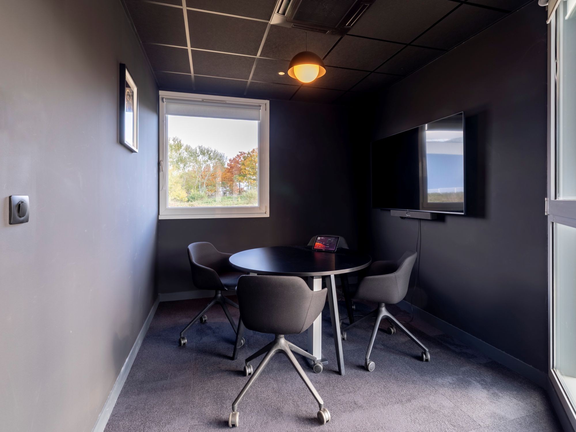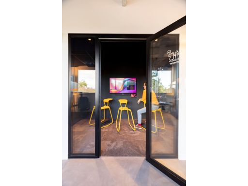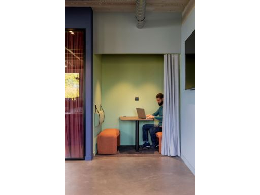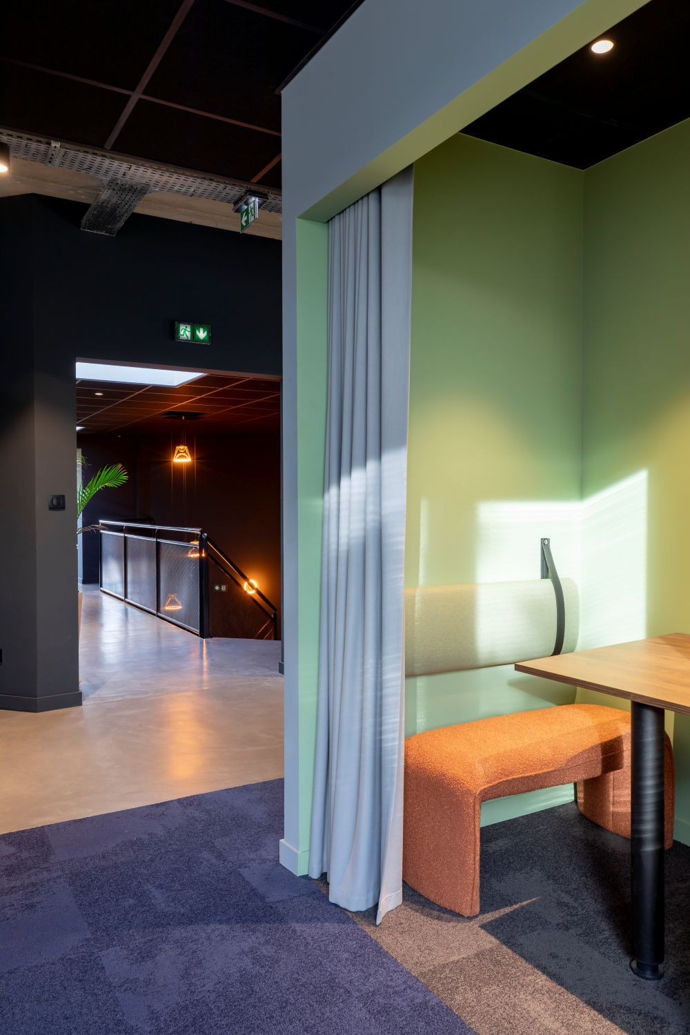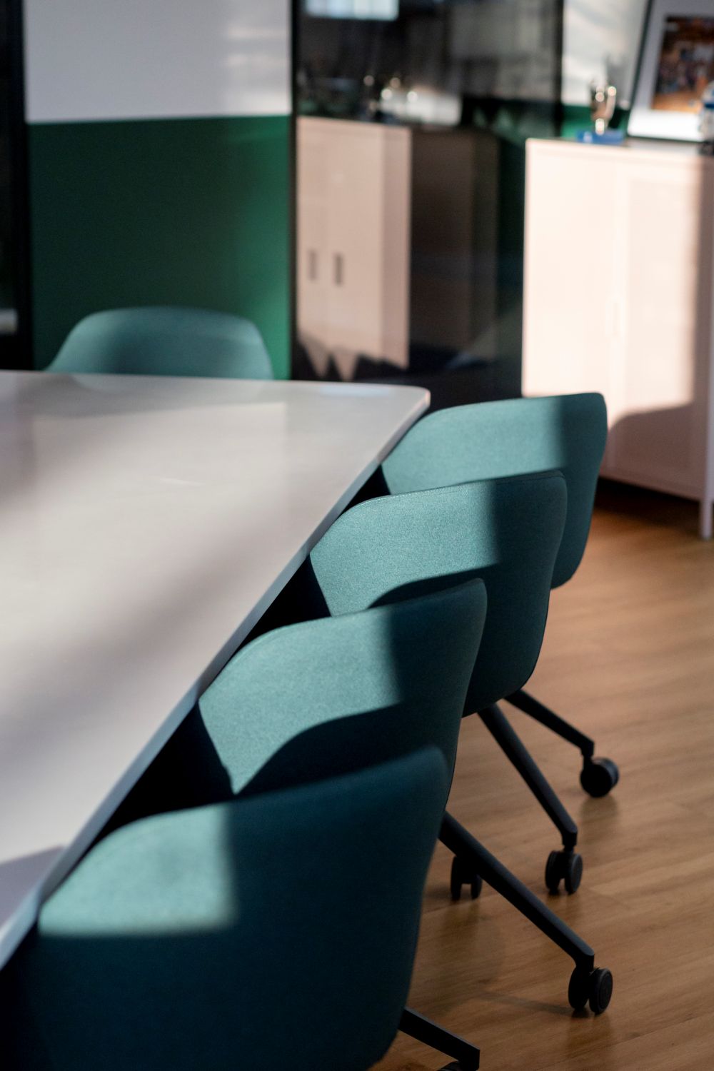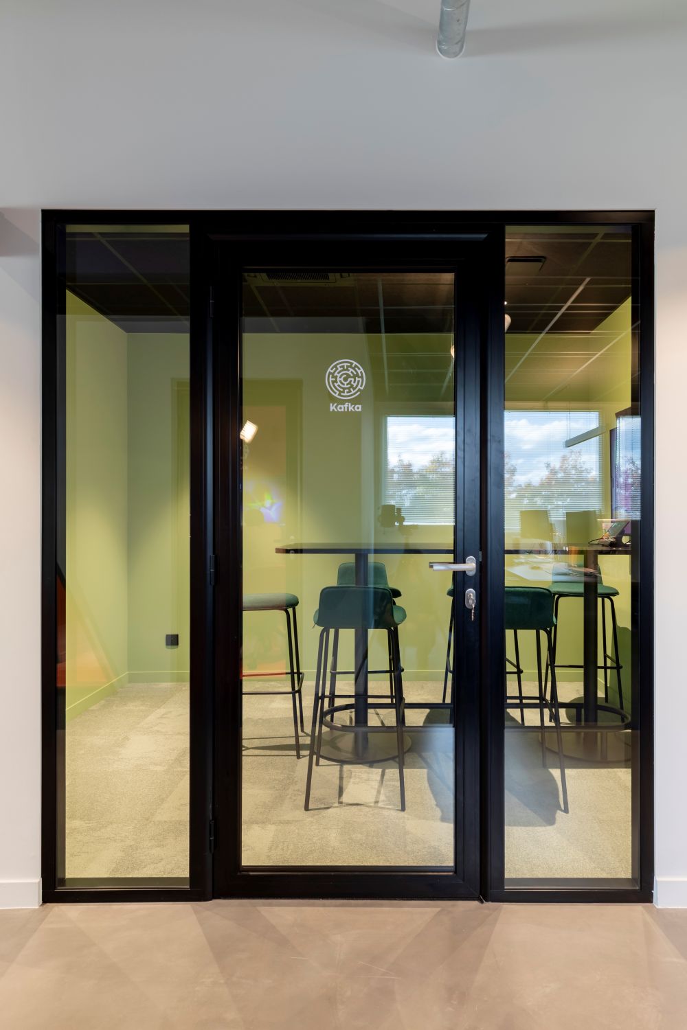 Les postes de travail des collaborateurs ont été placés près de la lumière naturelle, avec moquette et faux-plafond pour garantir le confort acoustique. L’espace se déploie ensuite en box individuels ou partagés, salles de réunion, espaces collaboratifs et salon informel. Discrètement caché derrière une bibliothèque, dans l’esprit d’un speakeasy, un espace vidéo. À vous de négocier avec KAM pour qu’ils vous dévoile le secret de l’ouverture.