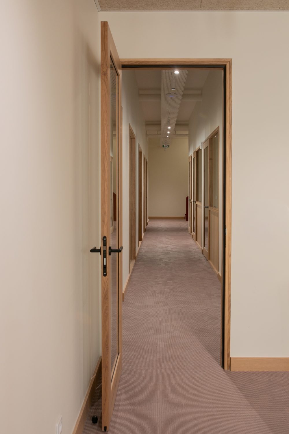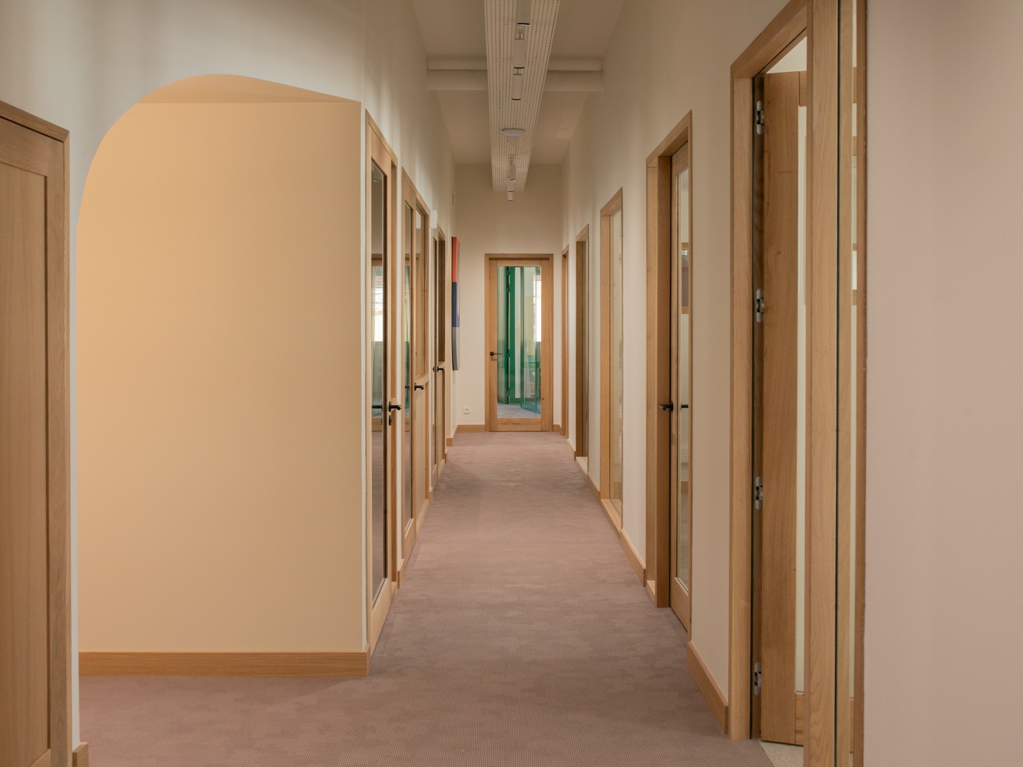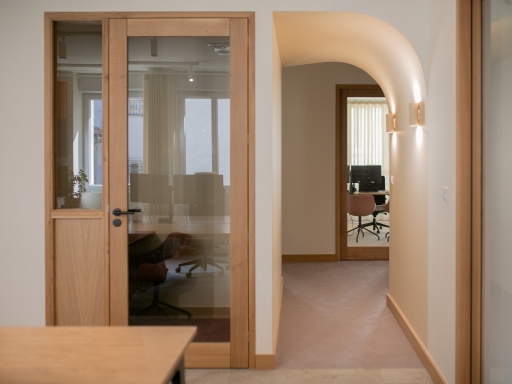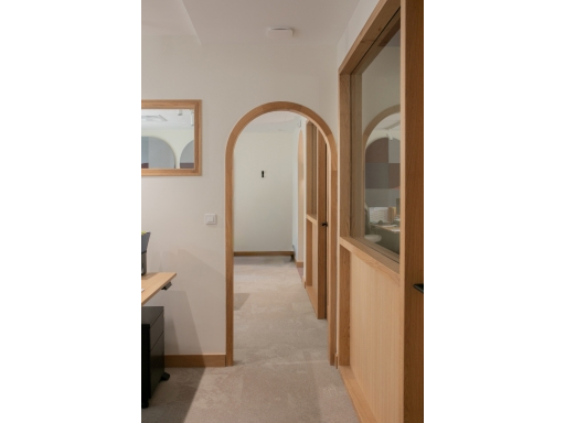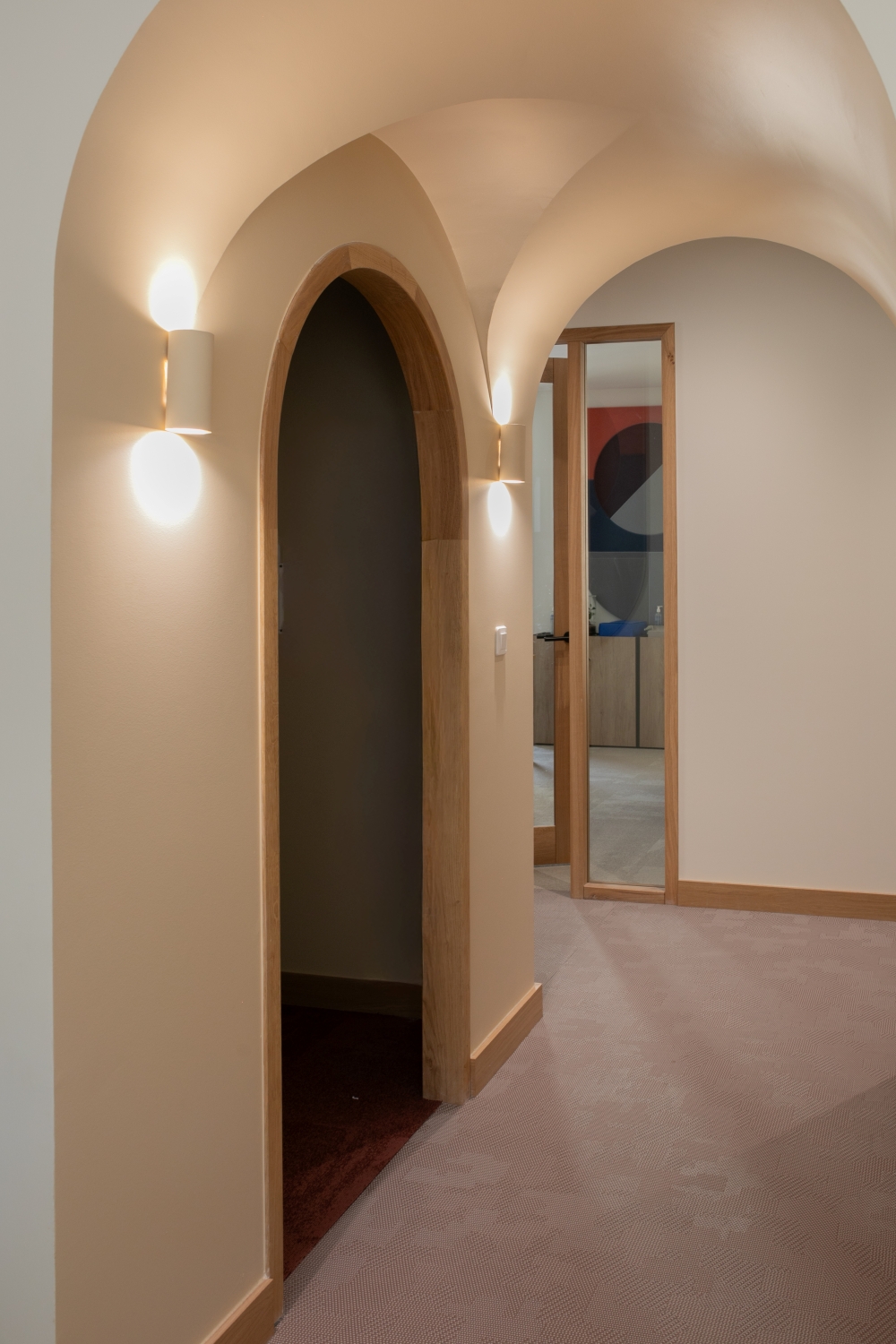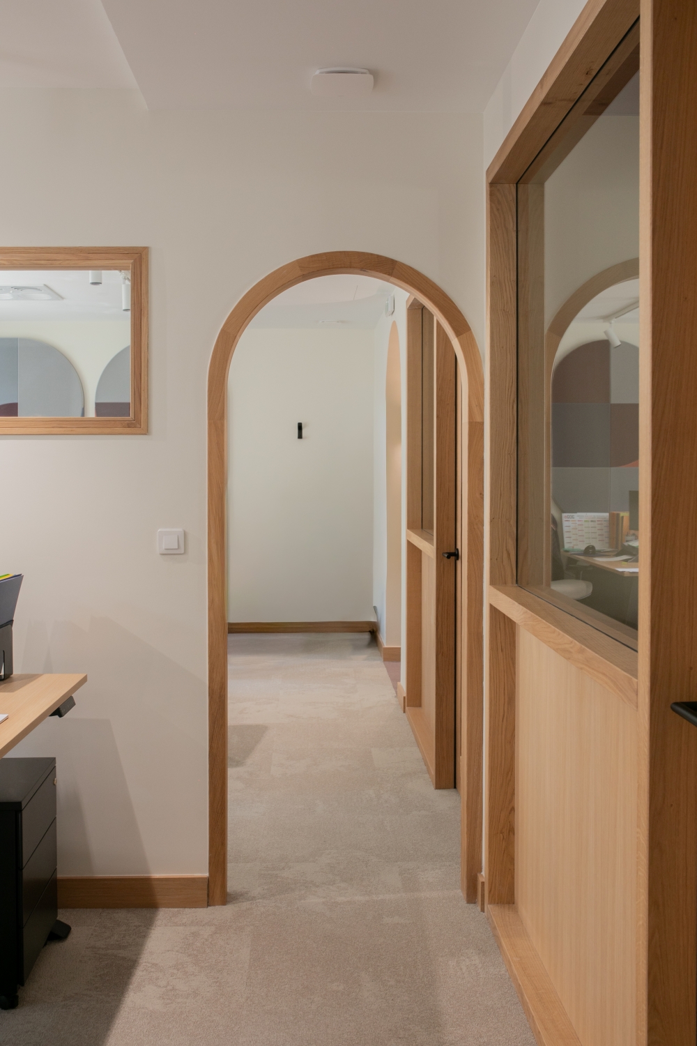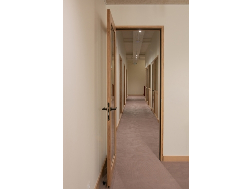 La lumière naturelle traverse les différents espaces et crée un parcours lumineux à travers les bureaux, espaces communs et salles de réunion. Nous avons créé une atmosphère ouverte et aérée grâce à un jeu de verrières, de portes vitrées et de fenêtres qui séparent et structurent les espaces. Les portes, couloirs et passages en arche accompagnent la circulation entre les espaces.