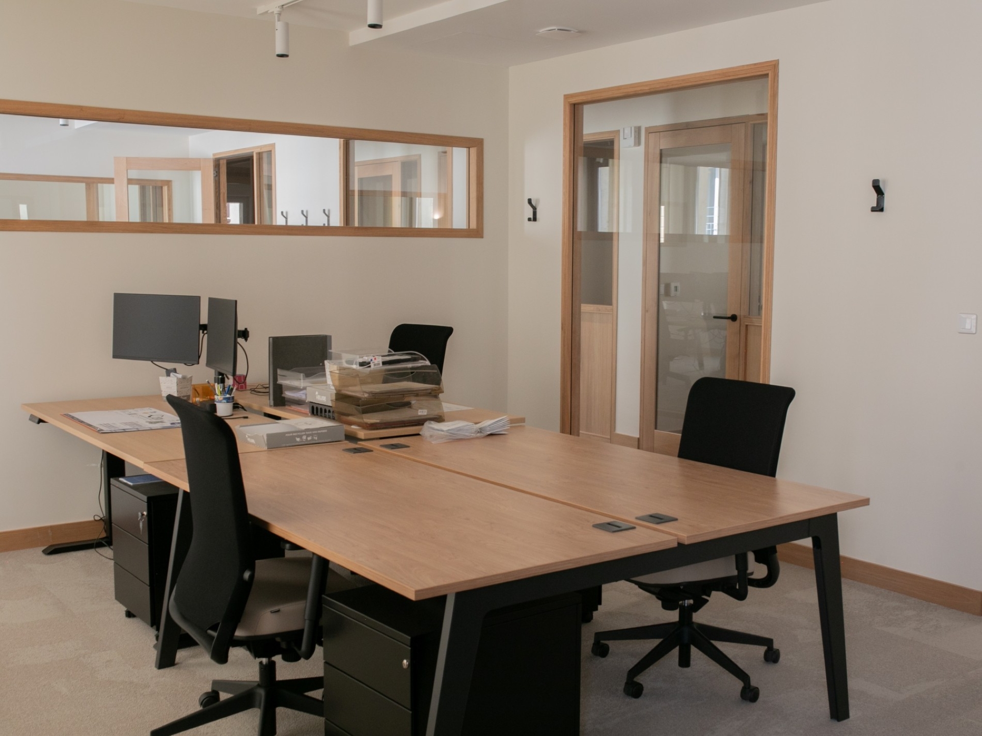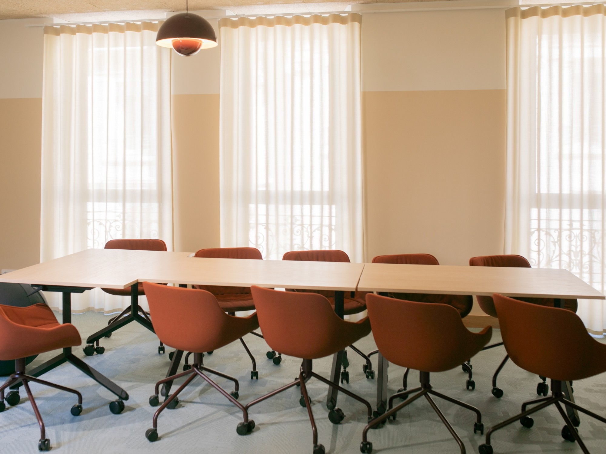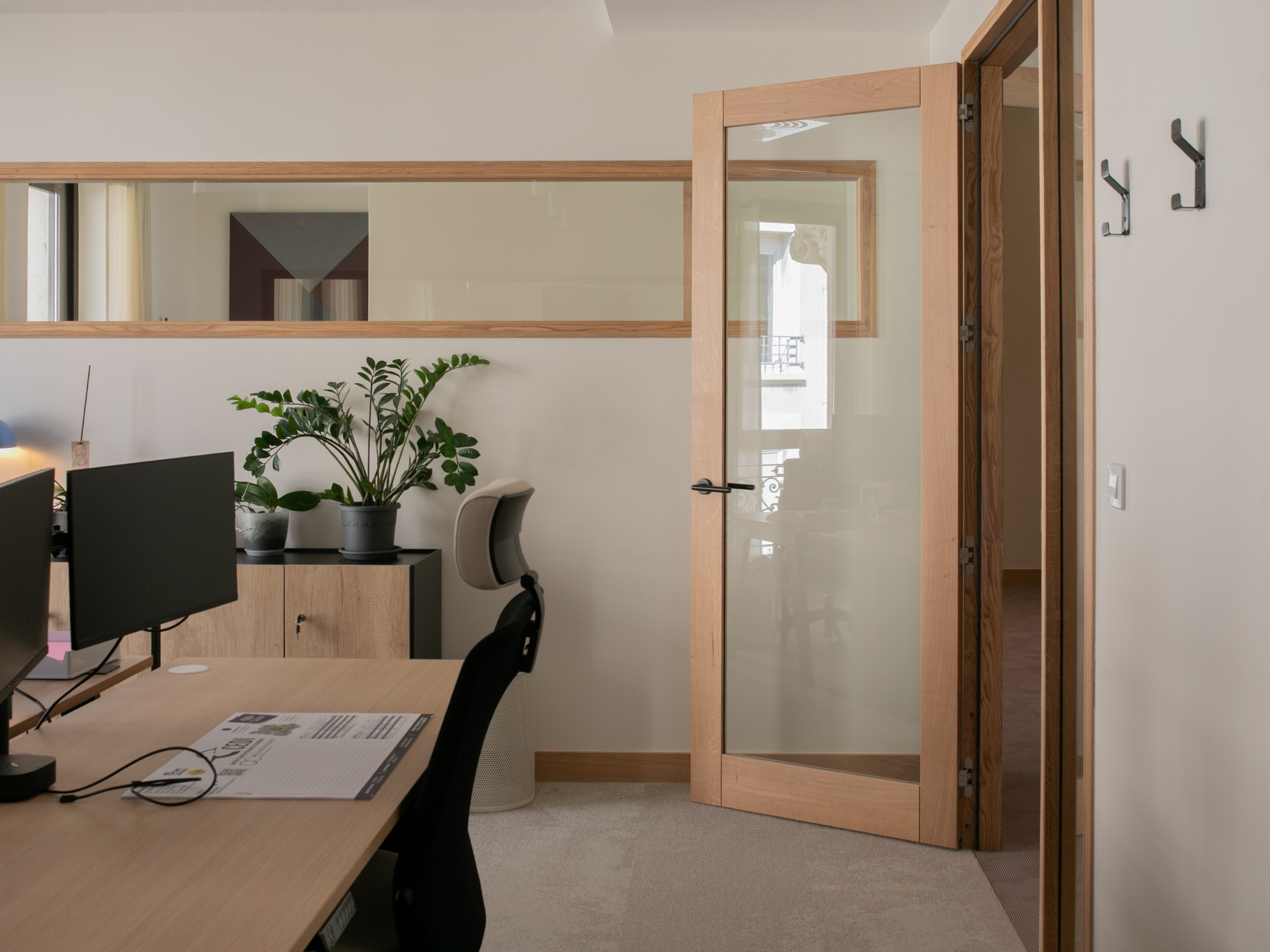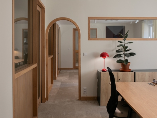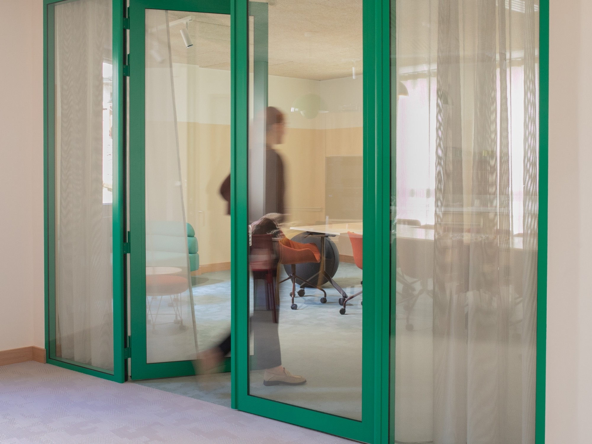 La lumière naturelle traverse les différents espaces et crée un parcours lumineux à travers les bureaux, espaces communs et salles de réunion. Nous avons créé une atmosphère ouverte et aérée grâce à un jeu de verrières, de portes vitrées et de fenêtres qui séparent et structurent les espaces. Les portes, couloirs et passages en arche accompagnent la circulation entre les espaces.