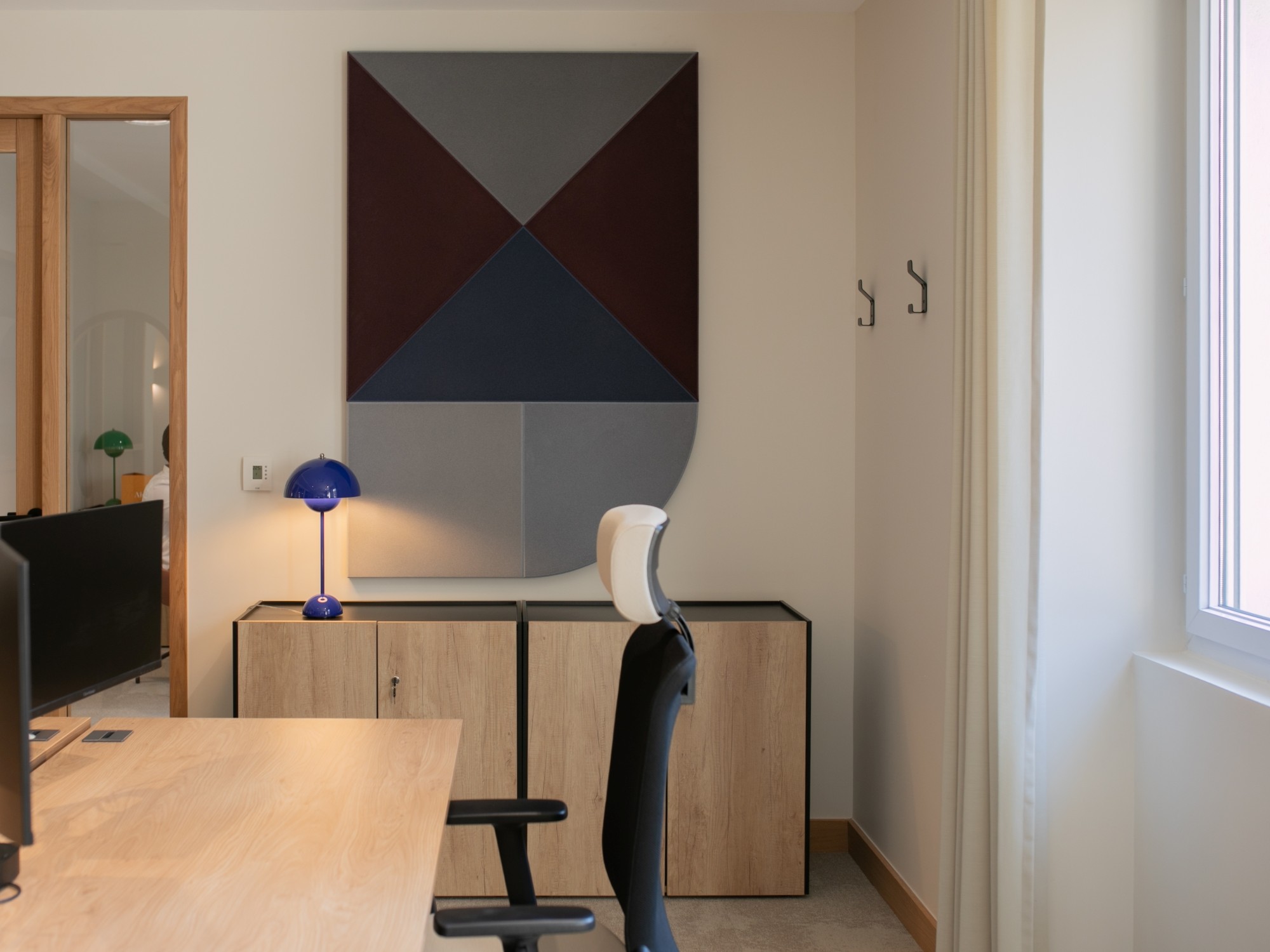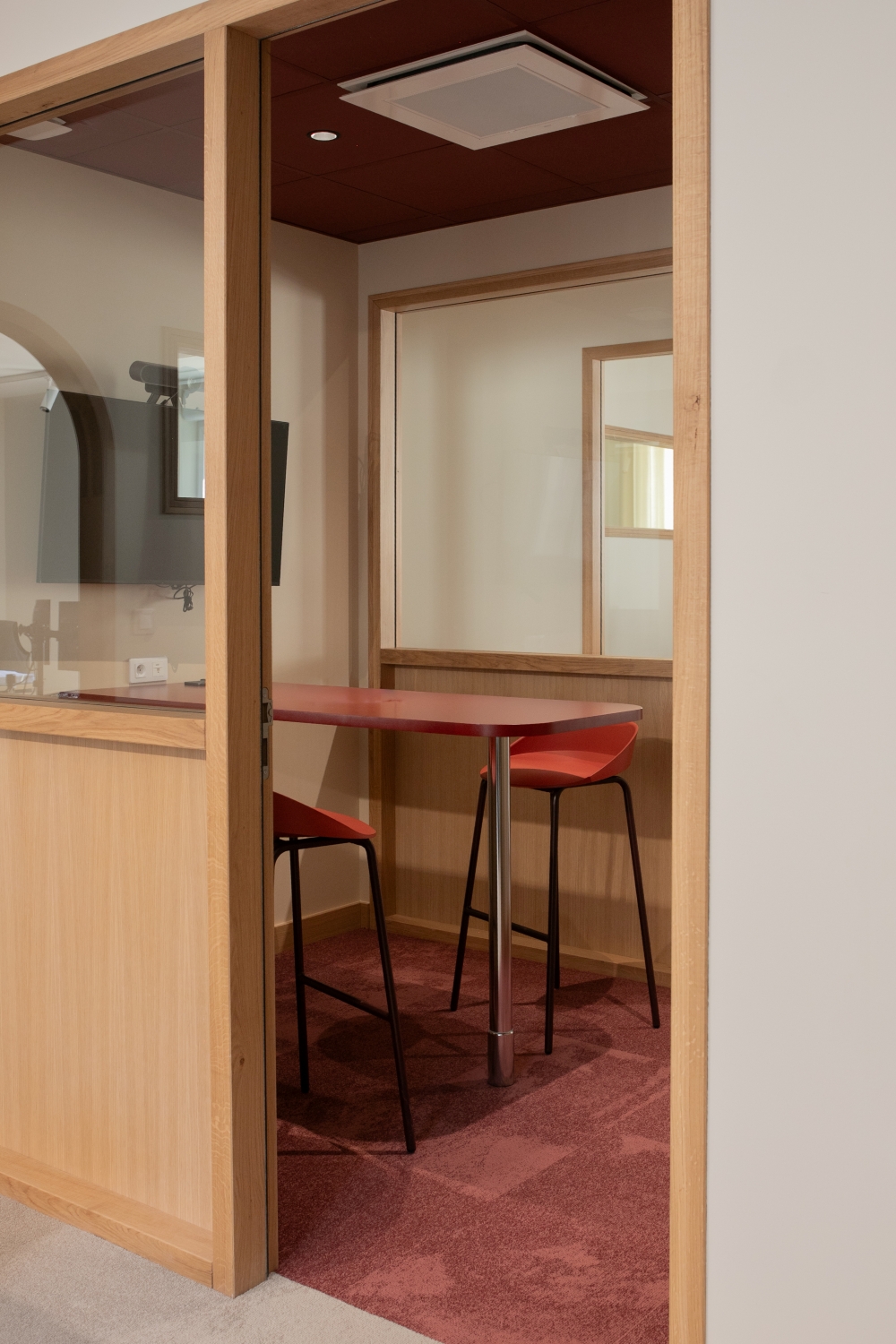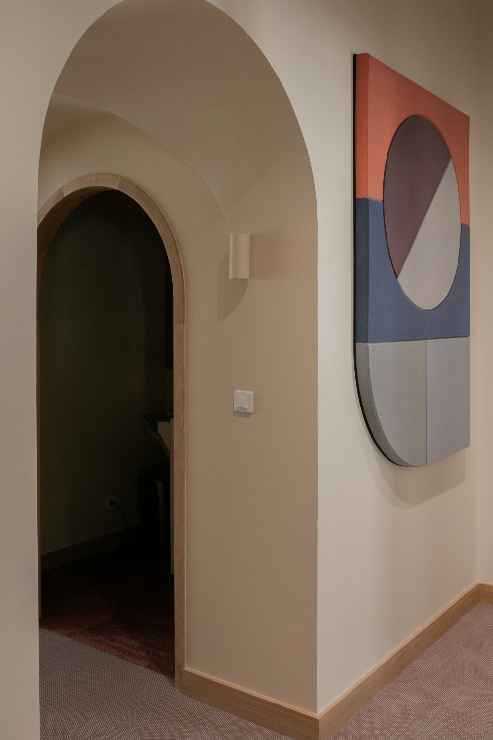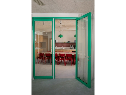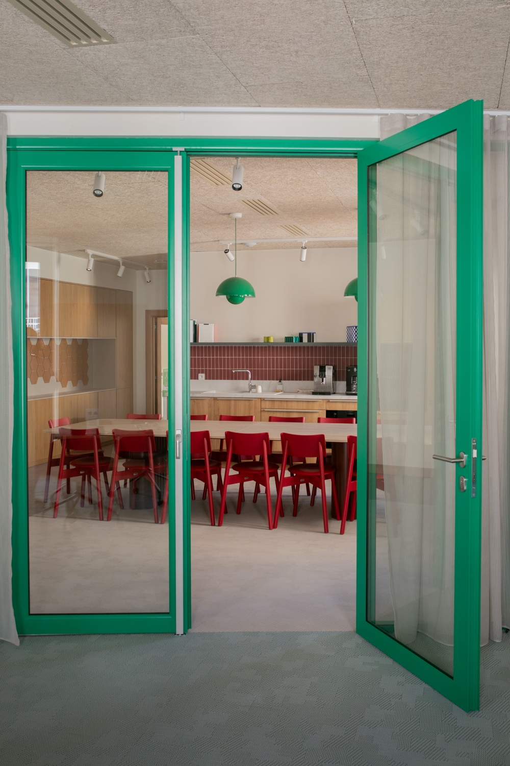 La lumière naturelle traverse les différents espaces et crée un parcours lumineux à travers les bureaux, espaces communs et salles de réunion. Nous avons créé une atmosphère ouverte et aérée grâce à un jeu de verrières, de portes vitrées et de fenêtres qui séparent et structurent les espaces. Les portes, couloirs et passages en arche accompagnent la circulation entre les espaces.