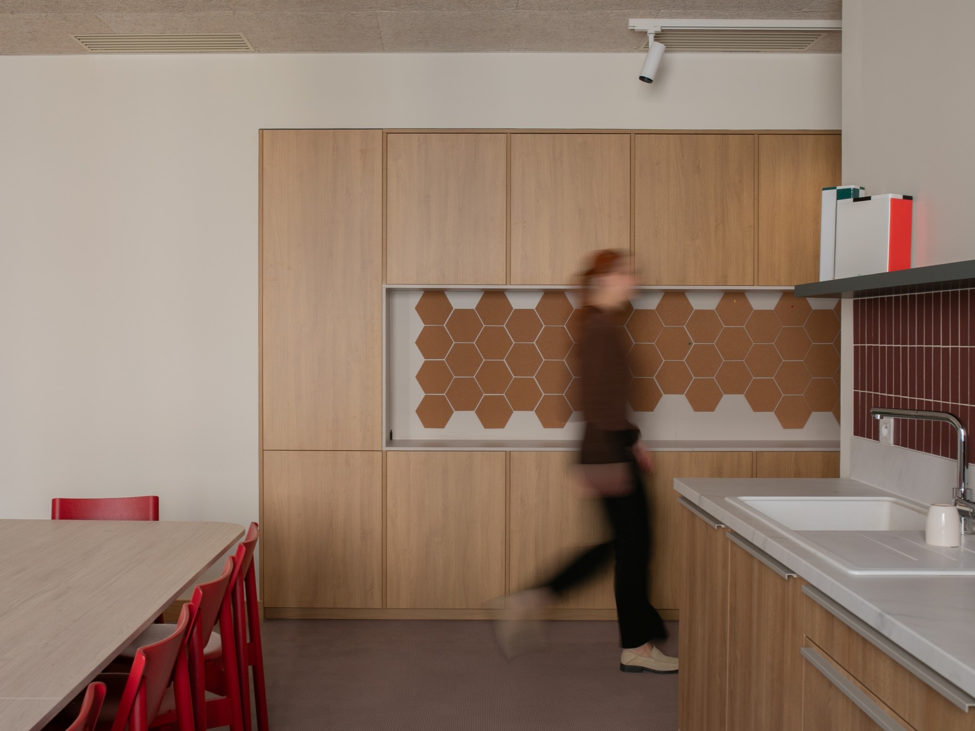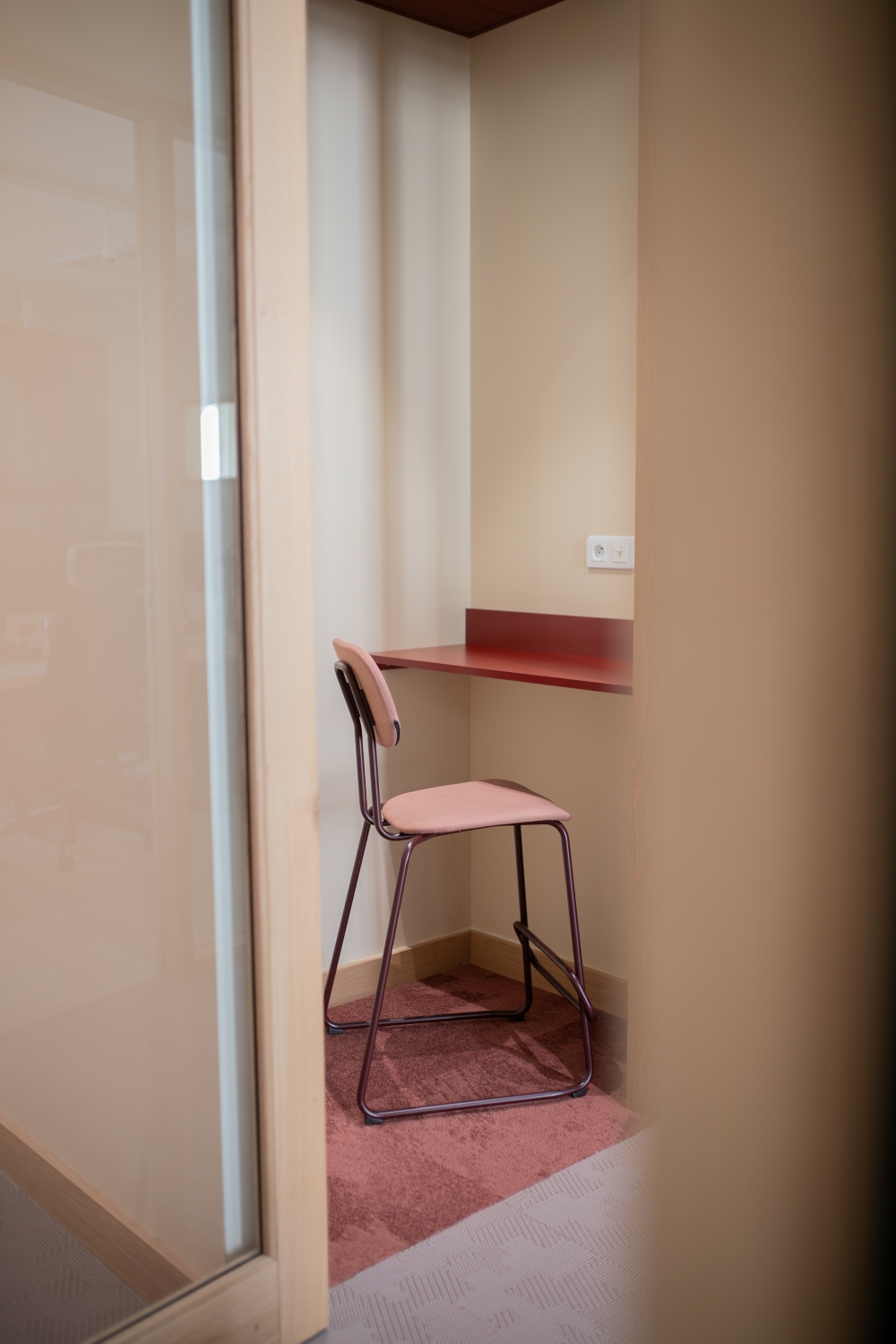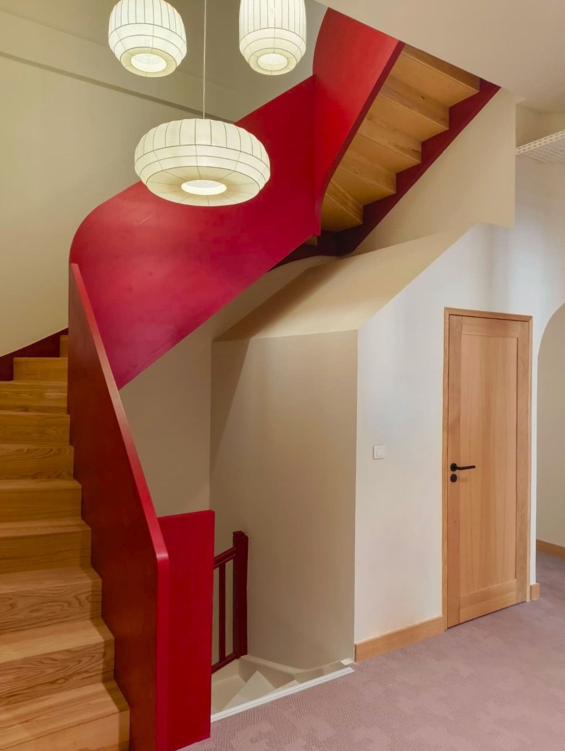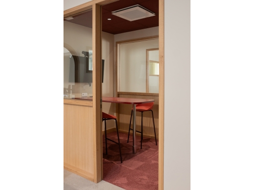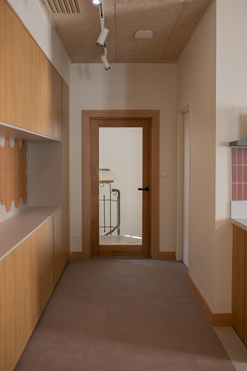 La lumière naturelle traverse les différents espaces et crée un parcours lumineux à travers les bureaux, espaces communs et salles de réunion. Nous avons créé une atmosphère ouverte et aérée grâce à un jeu de verrières, de portes vitrées et de fenêtres qui séparent et structurent les espaces. Les portes, couloirs et passages en arche accompagnent la circulation entre les espaces.