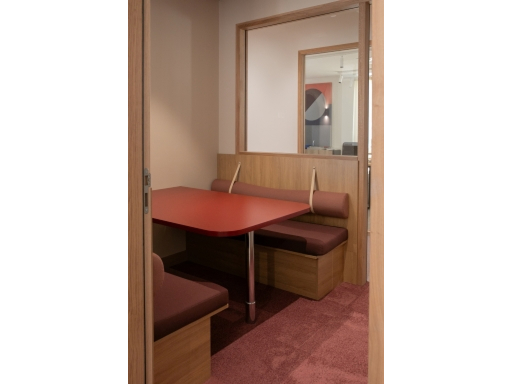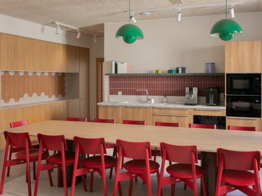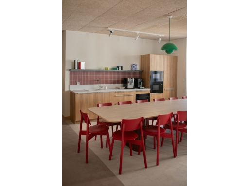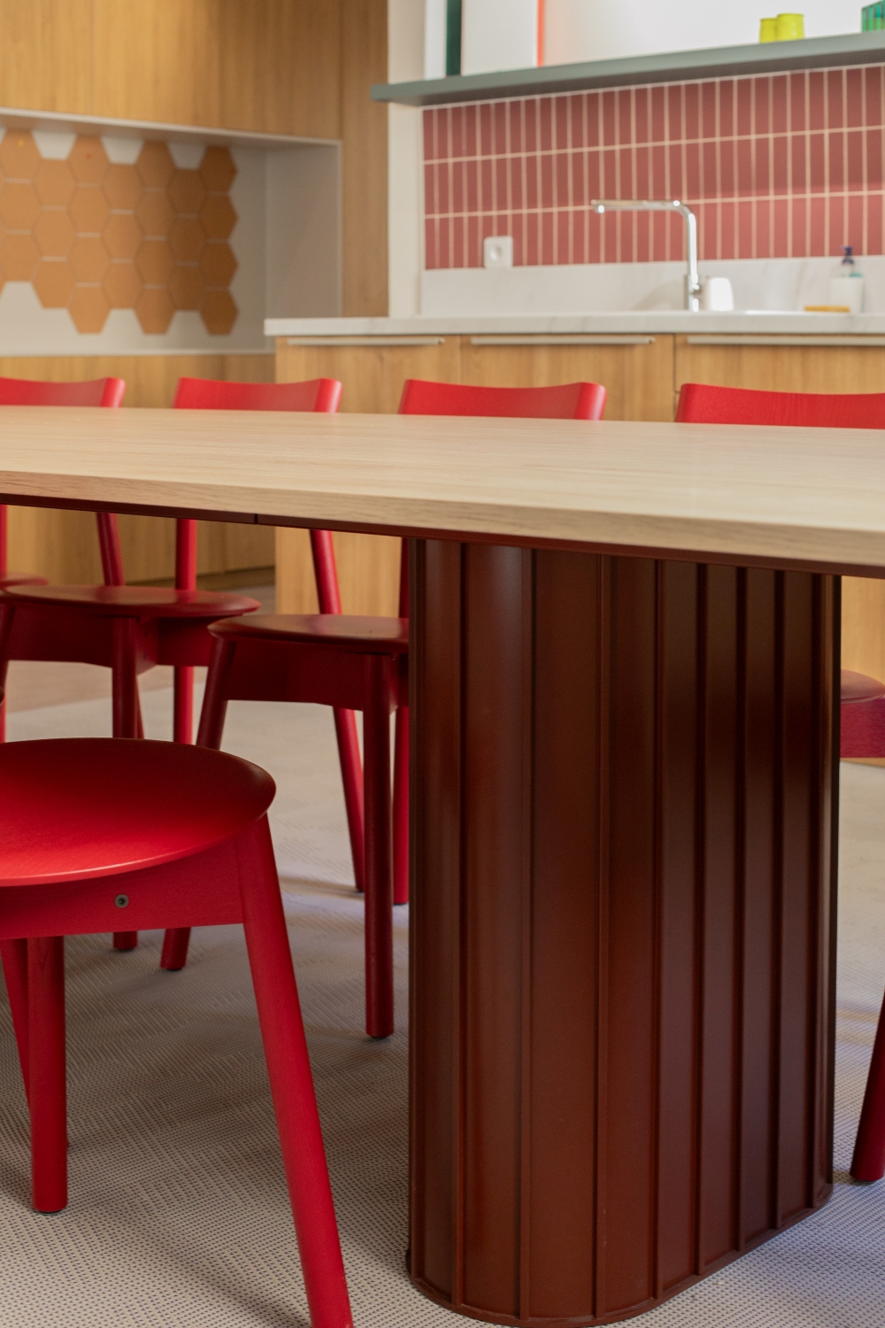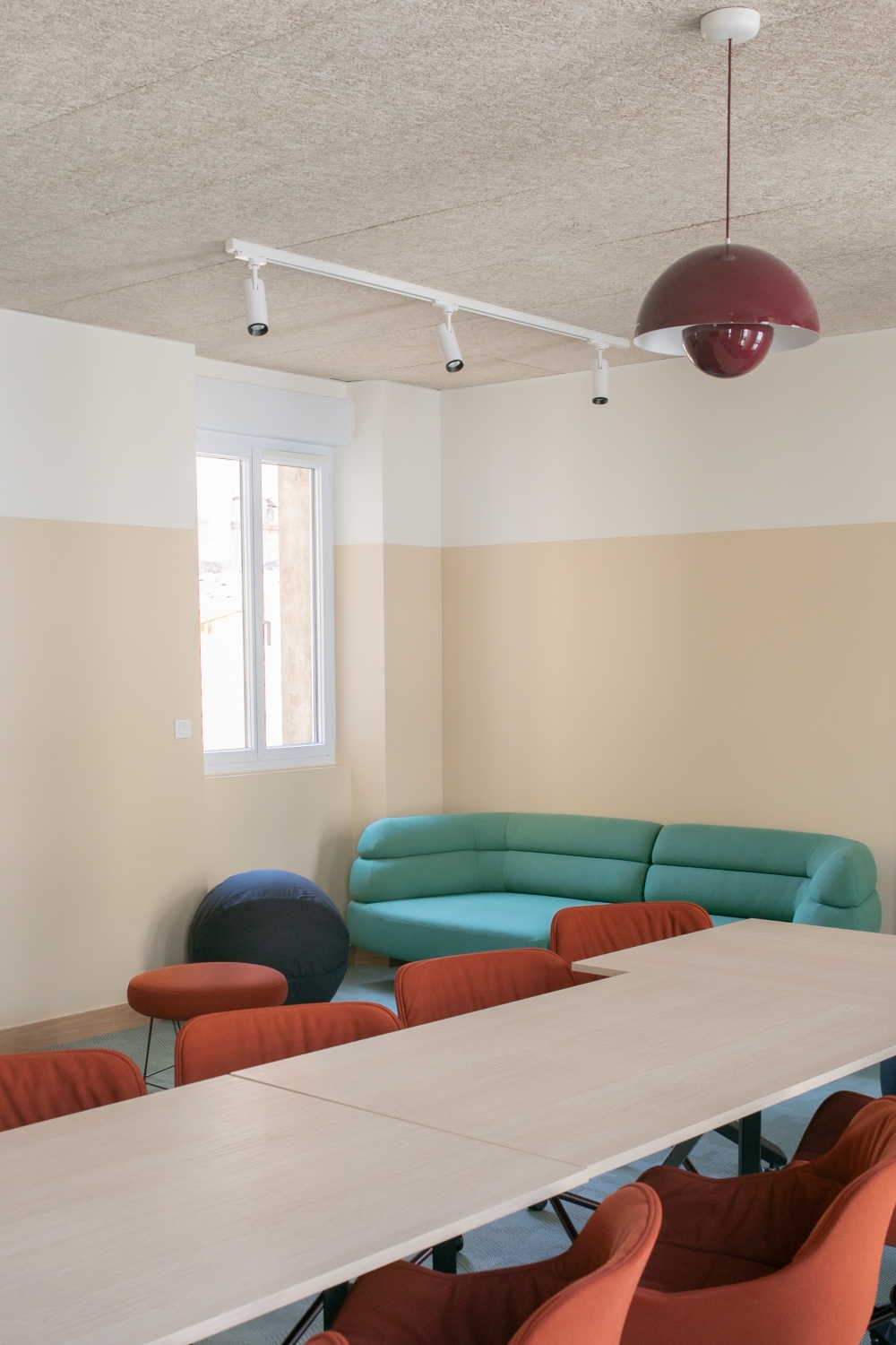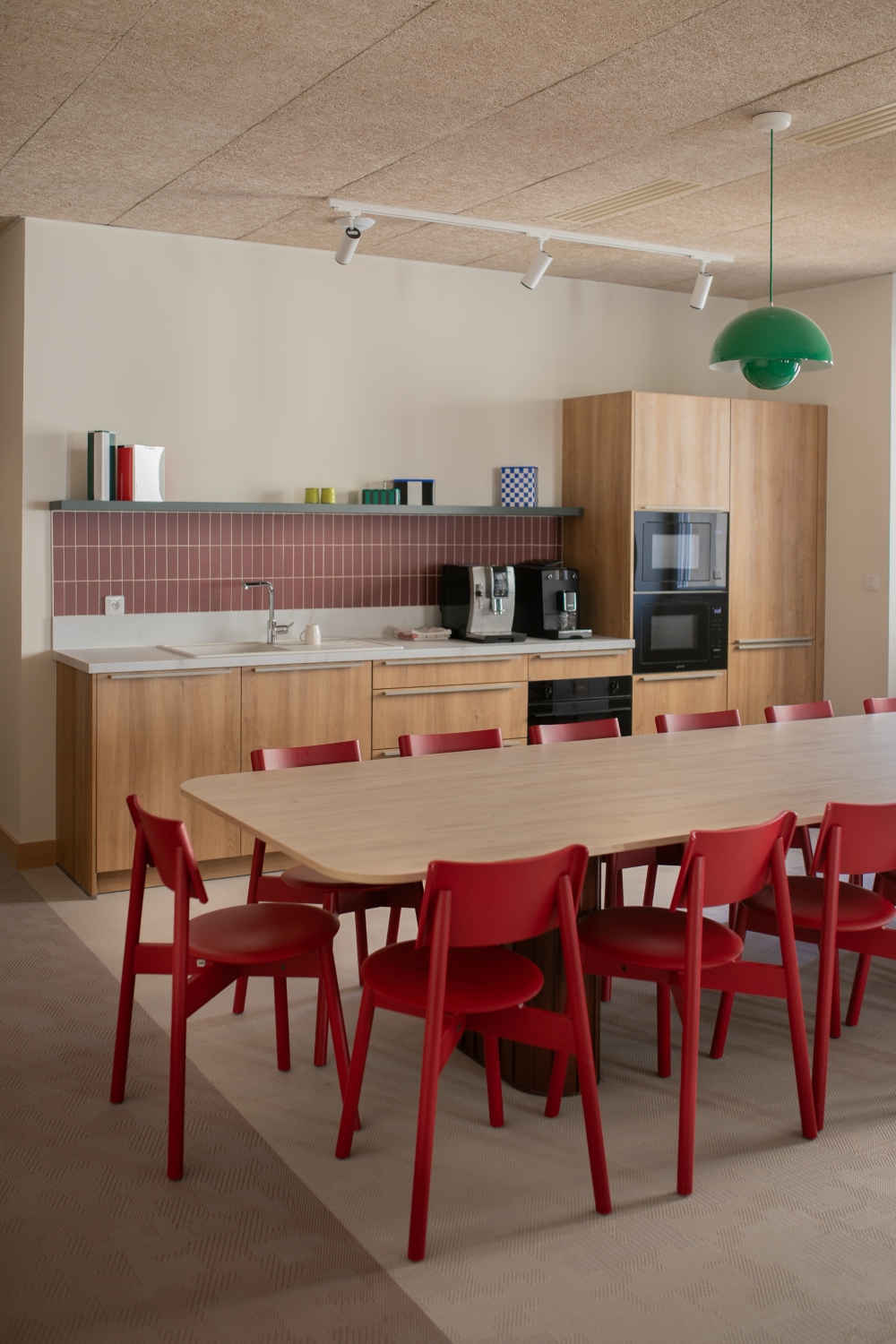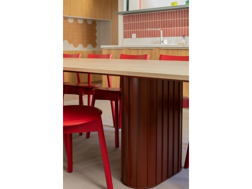 Des touches de couleurs franches viennent rythmer l'histoire. Le vert, le bordeau et le rouge apportent de la profondeur aux espaces. Le mobilier coloré favorise la convivialité et le dynamisme pour un espace chaleureux comme à la maison.